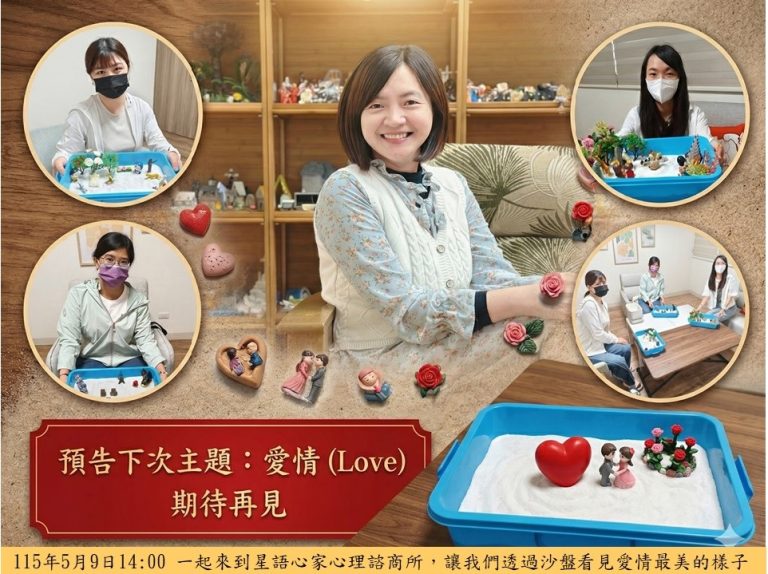 ➔ 前往 YouTube 頻道看更多星語心家 心理健康資訊 心理健康文章 藝術治療的奧秘 心理健康文章 《在沙子中,遇見最真實的自己》~沙盤諮商 心理健康文章 伴侶與家族會談 心理健康文章 心理諮商是什麼? 心理健康文章 【正念練習】在繁忙生活中找回平靜:正念減壓(MBSR)的 3 個簡單技巧 最新心理健康文章 藝術治療的奧秘 《在沙子中,遇見最真實的自己》~沙盤諮商 伴侶與家族會談 心理諮商是什麼? 【正念練習】在繁忙生活中找回平靜:正念減壓(MBSR)的 3 個簡單技巧 心理健康活動 星語心家115年課程兼職實習招募 心理健康活動 小團・創作・覺察:藝術治療督導之旅 心理健康活動 讓身體説説看:我在關係裡的樣子? 心理健康活動 系統視野下的個別治療進階訓練團體 心理健康活動 關係・身體・創作:系統視野下的療癒三部曲 最新心理健康活動 星語心家115年課程兼職實習招募 小團・創作・覺察:藝術治療督導之旅 讓身體説説看:我在關係裡的樣子? 系統視野下的個別治療進階訓練團體 關係・身體・創作:系統視野下的療癒三部曲 心理健康影音 EP874 別當孤獨的超人力霸王!如何經營「愛的存摺」,讓家不只是例行公事的應酬? 心理健康影音 【子琳開麥】你健康嗎?一起來檢視個人身心健康狀態吧!–中廣郭子琳feat.劉經偉心理師 心理健康影音 安心下午茶-多元文化教育Podcast:你不必成為一個「好人」 (feat.劉經偉心理師) 最新心理健康影音 EP874 別當孤獨的超人力霸王!如何經營「愛的存摺」,讓家不只是例行公事的應酬? 【子琳開麥】你健康嗎?一起來檢視個人身心健康狀態吧!–中廣郭子琳feat.劉經偉心理師 安心下午茶-多元文化教育Podcast:你不必成為一個「好人」 (feat.劉經偉心理師) 療癒小團募集中 紓壓小團體~~「壓力釋放體驗活動」 療癒小團募集中 下一次讓我們看見愛情最美的樣子 療癒小團募集中 與藝術家的晨間約會 最新療癒小團募集中 紓壓小團體~~「壓力釋放體驗活動」 下一次讓我們看見愛情最美的樣子 與藝術家的晨間約會 關注我們 歡迎透過社群媒體與我們互動,獲取最新心理衛教資訊 我們的合作夥伴 同步最新活動中... 同步最新活動中...