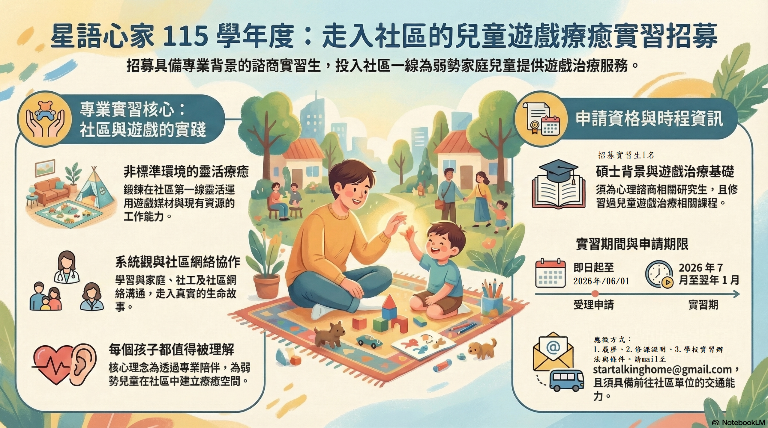 (信件主旨請註明:「應徵115學年度社區兒童遊戲療癒實習生_您的姓名」)