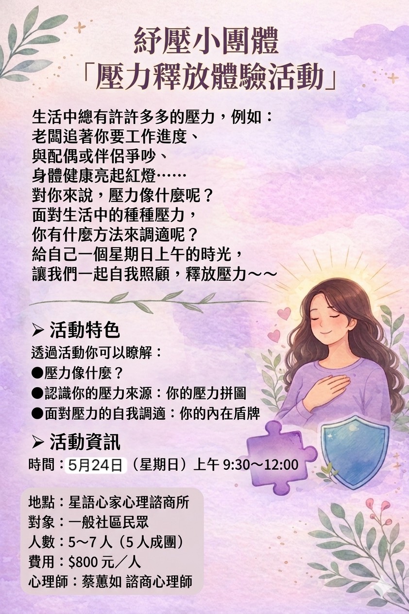 - ✨ 【打造心靈盾牌】 學習實用的自我調適技巧,建立面對壓力的有效防護網。